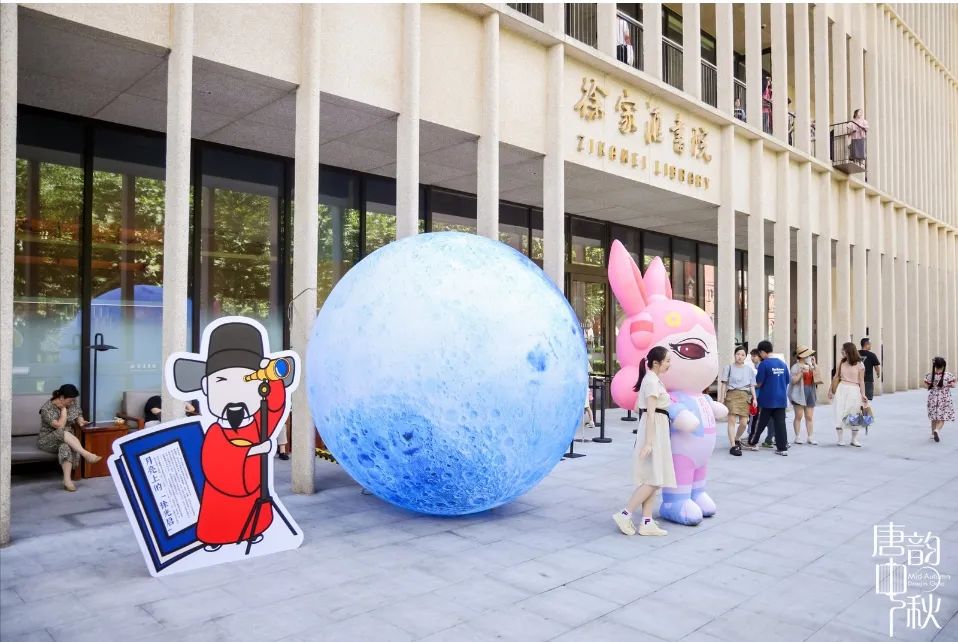 在徐家汇书院,你还能随时和月亮撞个满怀。可以是一首诗,一段话,一个谜语,一只正在跳舞的玉兔,一台讲座,一本绘本,一场露天电影……它们以各种形象、各种形式,出现在书架上、长廊处、楼梯间、广场上……