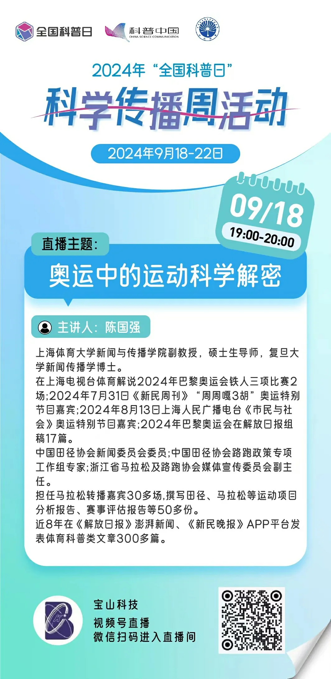 2024年宝山区“全国科普日”科学传播周将于9月18日至22日在“宝山科技”视频号直播。活动涵盖奥运科技、气候变化、合成生物学、太阳系奥运会及科普电影创作等主题,由多位专家学者主讲。观众可通过关注视频号或扫码参与,享受科学盛宴。此次活动旨在提升公众科学素养,推动科技创新与科学普及相结合,期待您的参与!