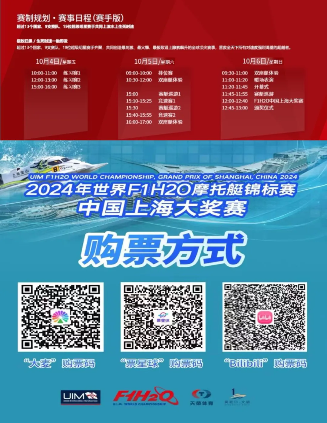 F1H2O上海大奖赛将在上海吴淞口国际邮轮港内档水域约30万方以及周边上海海上世界、零点广场和吴淞炮台湾国家湿地公园区域举办。F1H2O上海大奖赛主要的赛程安排:10月4日上午10点至下午4点为练习赛;10月5日上午9点至10点为排位赛,下午3点10分至3点55分为竞速赛;10月6日11点20分至11点45分为赛事开幕式,12点至12点40分为决赛,12点45分至13点为颁奖仪式。届时蓝天白云、F1H2O摩托艇、顶级赛队、专业赛手、赞助商、广告商以及热情观众与亚洲最大的国际邮轮港交相辉映,将形成绝佳的观赛体验和一道亮丽的风景线。