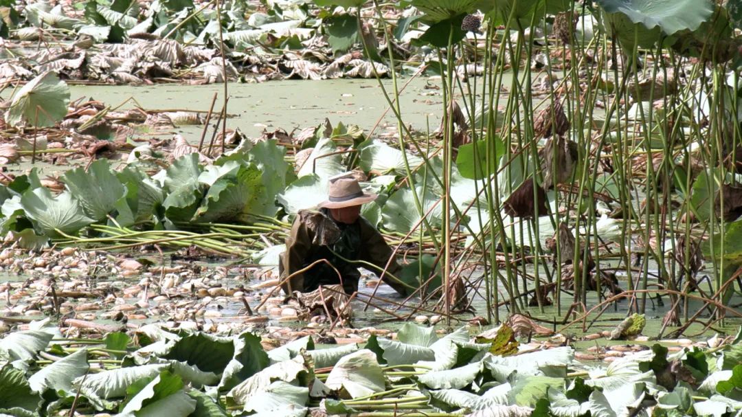 在金泽镇莲湖村,只见藕农们头戴斗笠,身着防水服,手持高压水枪,熟练地在泥塘中探寻,不一会儿,洁白粗壮的莲藕便被逐一揪出,堆放在岸边,荷塘内一片繁忙。