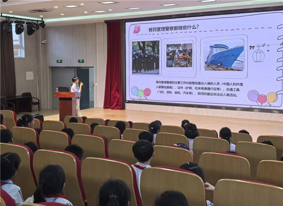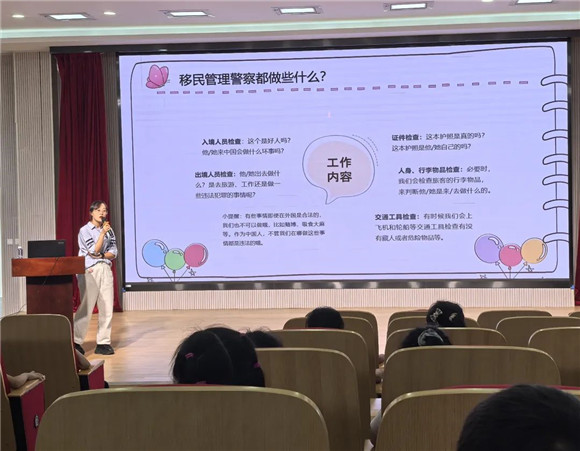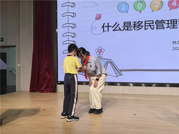 安全保障与乐趣相得益彰,国外风景正好,但只有步骤正确合规,游玩安全才能收获喜悦。张警官也细心地提醒孩子们在外出行要留心的事项,从护照篇、签证篇、飞机篇、手机篇、现金篇和保险篇等为小朋友们作了详尽的讲解。