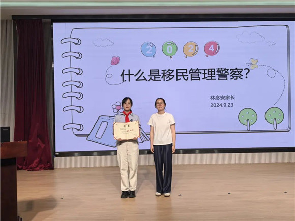秋风送爽,浦东新区澧溪小学邀请到一(1)班小朋友林念安的家长,从事出入境旅客查验工作的上海机场边检站一级警长——张佳丽同志来到我们可爱的学校,深入课堂,与小朋友们共享职业趣事,讲解出入境安全及相关知识。