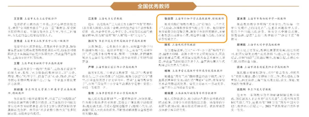 张倬霖的引领示范作用,辐射区内外。她是第四期双名工程攻关计划成员、上海师范大学研究生导师、市级学科育德子项目校外指导专家、《上海中学数学》理事会理事,多次在市区级以上层面做主题讲座和经验交流,并且担任华东师范大学开放教育学院网络市级课程的主讲教师,广受好评。