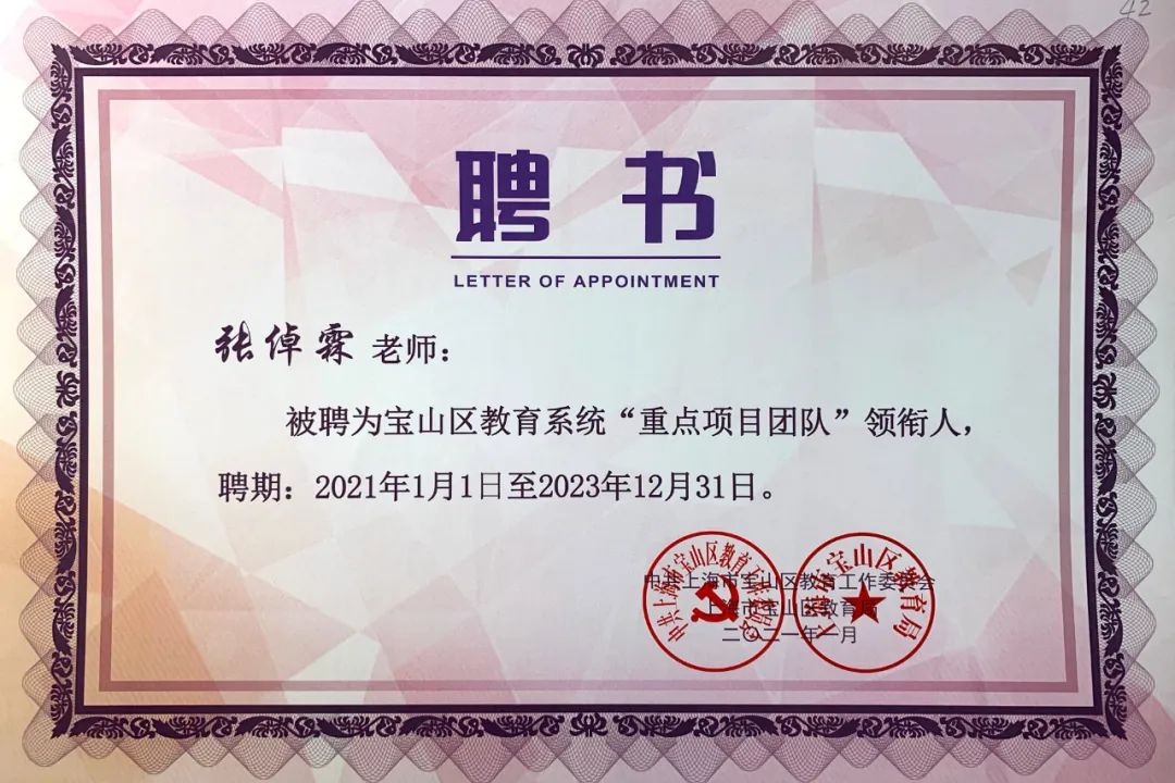 连续两届被评为区首席教师,带教区内骨干团队和青年教师,领衔区教师跨学科能力培育第一轮试点项目,被聘为2021-2023年区高中数学重点项目领衔人。担任教研组长期间,带领组内教师编写《教材全解》《创新教学设计》等丛书,均已出版发行,教研组荣获宝山区优秀教研组。