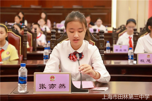 在庄严的气氛中,各校代表共同体验了模拟审议、投票及模拟提案。在模拟提案环节中,学校代表张亦然同学立足实际,就“对生产、流通、消费领域推进资源节约利用,加大源头减量力度”这一议题提出相关建议。