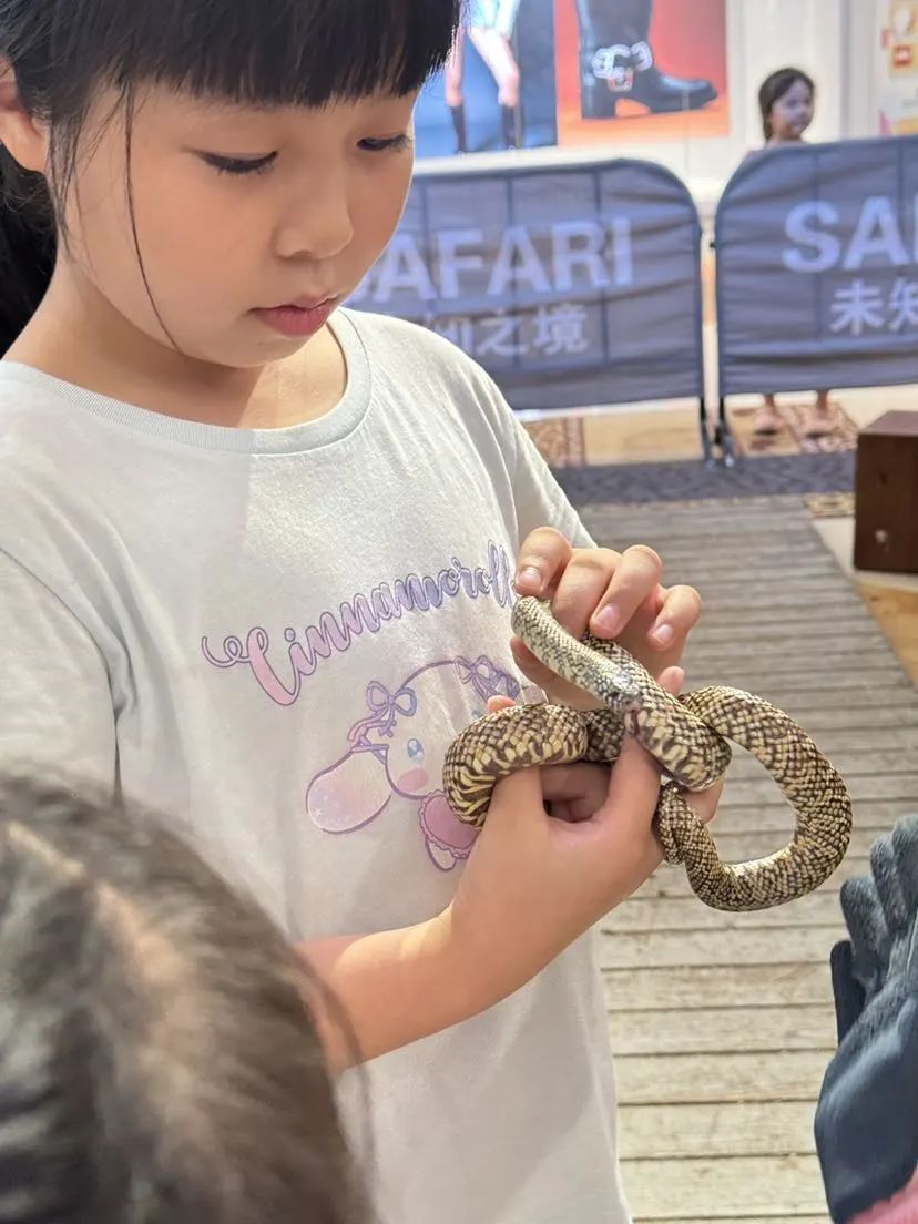 工作人员介绍道:“这是沙漠王蛇,它可以吃掉比它有毒性的蛇,对毒性免疫。它的体长是120到160厘米,喜欢生活在丛林与沙漠中。”小朋友小邓在工作人员的引导下,勇敢地摸了摸沙漠王蛇,惊喜地说:“看起来这么可怕,原来摸起来好舒服,冰冰凉凉的,软软的。”