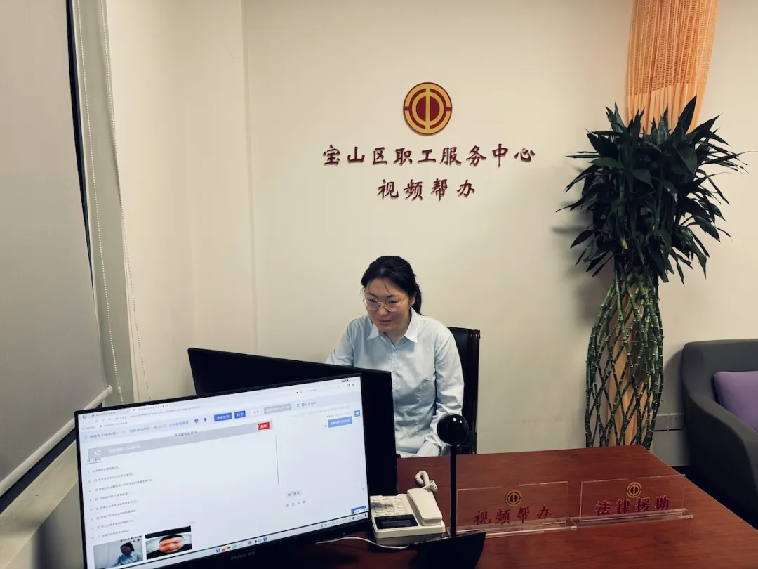 宝山工会职工服务“一件事”平台引入“视频帮办”功能,一位法援律师正为劳动者提供线上维权指导。