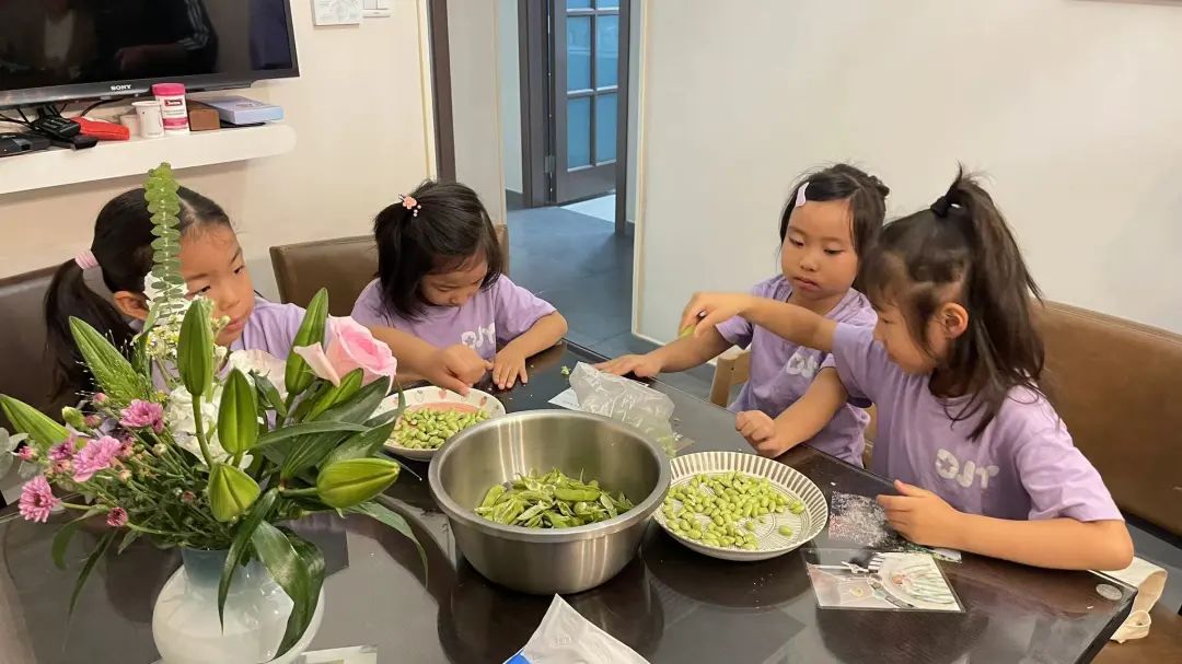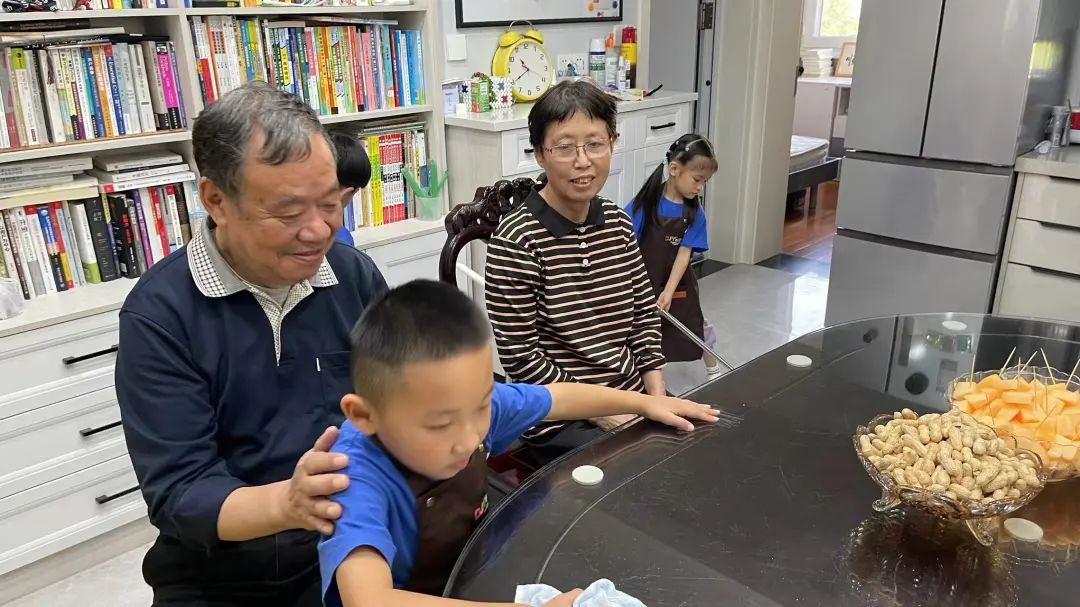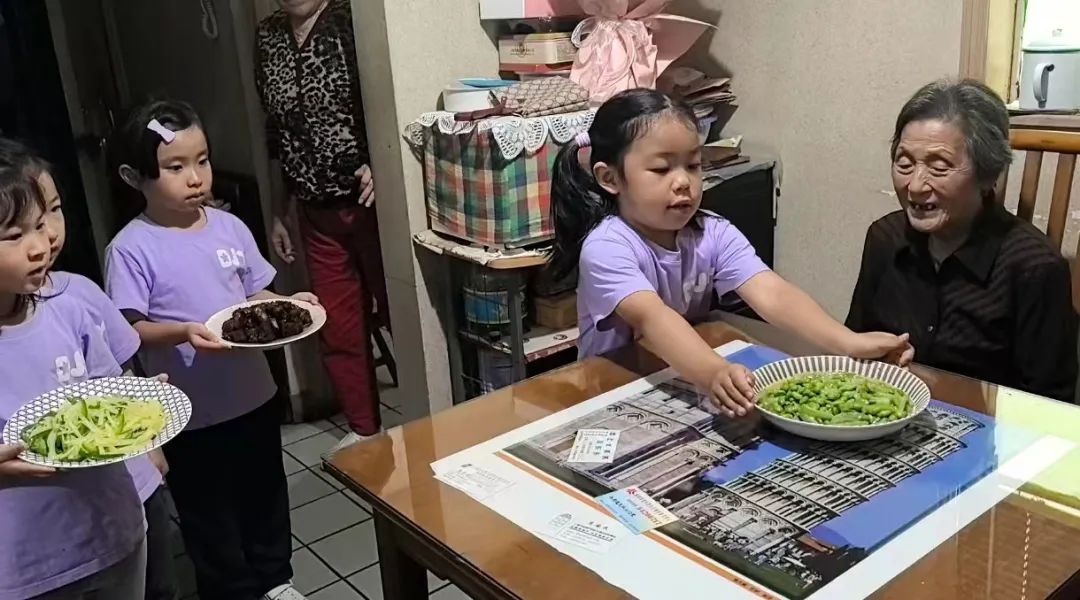 回到家,孩子们纷纷撸起袖子充当小助手。他们围坐在小桌边,每个人都在努力地剥着绿油油的毛豆荚。很快,四菜一汤就做好了,大家来到邻居童阿婆家,为她送上了一桌丰盛的午餐。