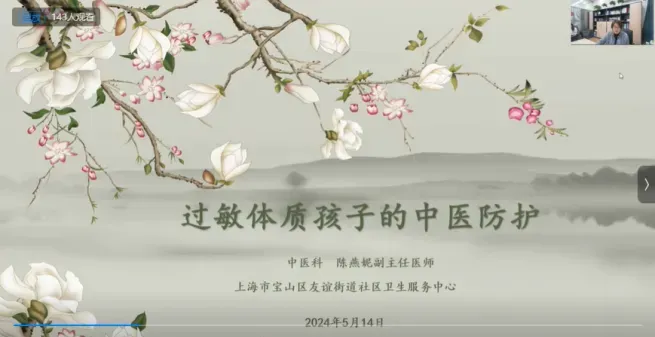 2024年5月14日18:00,陈燕妮副主任医师为宝山区教育学院实验学校1-5年级家长们开展一堂网络直播中医儿科讲座。从什么是过敏体质、过敏原检查、过敏用药、家庭防护等方面授课。