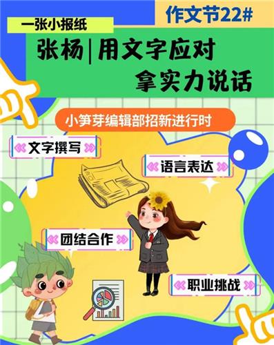 《义务教育课程方案(2022年版)》中明确要求“各门课程用不少于10%的课时设计跨学科主题学习”,强调通过“开展跨学科主题教学,强化课程协同育人功能”。在此目标下,本届作文节,我们以跨学科主题学习方式,帮助学生在语文学科和其他学科之间建立牢固的联系,去完成编辑一张报纸的任务,以更有效的方式学习,提高问题解决的能力。