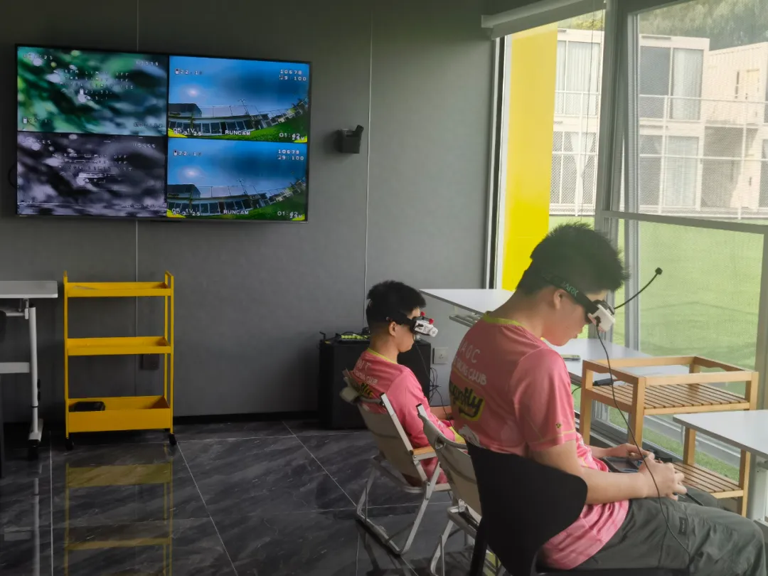 和绿地相连的一座集装箱房子是操控室,只见两名飞手正戴着专业眼镜全神贯注地操控遥控器。而室外的训练场上,两架信鸽般大小的无人机迅速闪转腾挪,灵活地避开一个个障碍物,穿越一个个标记点。