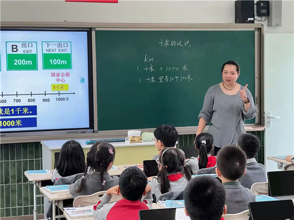 在三年级的课堂教学中,佘天怡老师立足单元视角,聚焦真实情景,借助“三个助手”将数字化教学有效融入了《千米的认识》这一节课中。学生在熟悉的生活情境中,先感知了1千米到底有多远,通过体验行走1千米所花费的时间,将量感“可视化”,进一步感受到生活中处处有数学,从而加强了学生对于千米的量感,体会“千米”在生活中的应用价值。