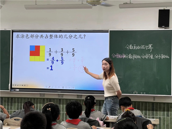 周倩老师所执教的为四年级第一学期《分数的加减计算》第一课时的内容。在本节课的教学中,周老师从四年级学生的认知特征出发,以猪八戒吃西瓜这一情景作为切入点,在结构化视野和任务式的活动设计中展开了有效教学。