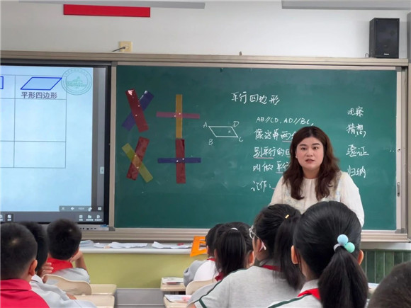 五年级的沈诗玮老师深入理解了现行教材的编排特点,结合新课标中关于“图形的认识和测量”相关要求,在新授环节让学生通过拼摆透明色带的课堂活动,学生在动手实践中观察和验证平行四边形的基本特征。