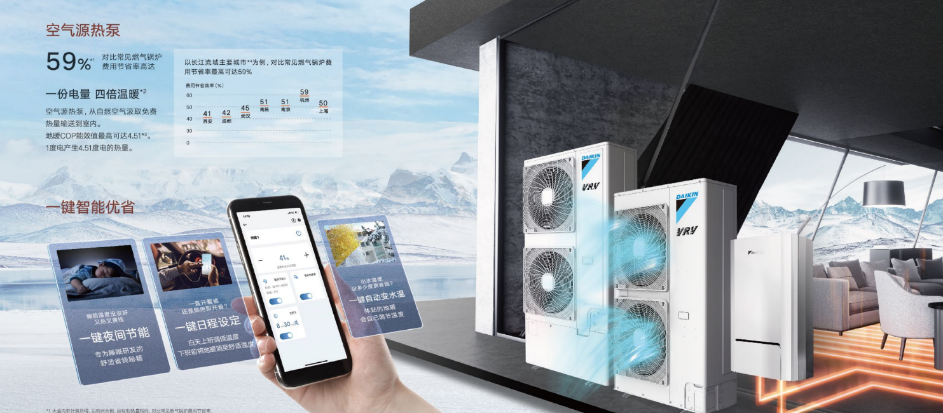 此外,为确保用户在日常使用中获得节能舒适的体验,大金提供“夜间节能、离家节能以及自动调水温”三大节能模式,用户通过手机 app 即可轻松一键操作,既能享受舒适的采暖体验,又能满足节能节电的需求。