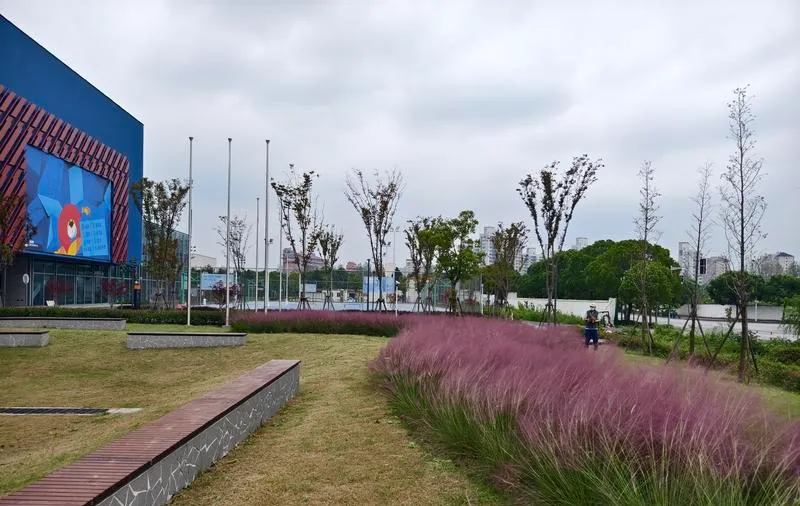 杨行体育中心是新近对外逐步开放的一个区域性综合体育中心,它南侧的绿化带呈现出缤纷的色彩。时值金秋,流线型的粉黛乱子草群落仿佛一团团粉色的云雾,穿插在绿茵茵的草坪上,在微风的吹拂下起起伏伏,给人一种梦幻般的视觉感受。