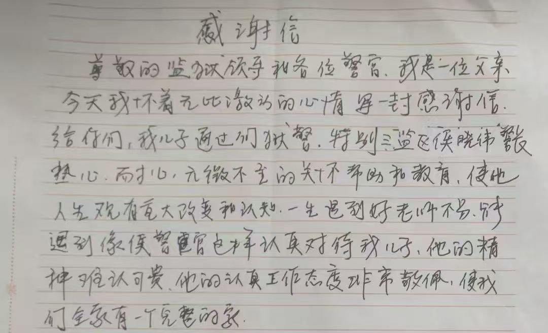 民警趁热打铁,语重心长地说,要理解母亲良苦用心,好好改造,争取早日回归、母子团聚。当晚,赵蒙就写了一封长长的感谢信,向监狱和民警表达了感谢之情,更表达了认罪悔罪、改造改好的决心。