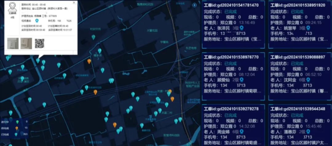 “长护e安”三级智能监管平台对接市级长护险大数据,一级平台为区医保局智能监控平台;二级平台为居家护理服务机构智能管理平台;三级平台为护理员智能移动平台。同时,通过蓝牙信标、智能定位工卡以及保护隐私摄像头等物联网监控设备,采集护理行为相关数据,让长护险服务留痕,并应用视频飞检、大屏实时监控和智能服务评价等智能监管手段,对护理服务进行有效监管。