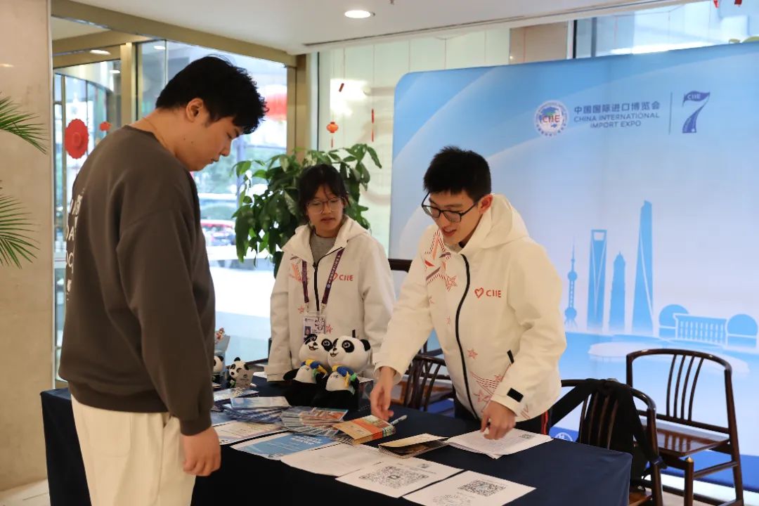 除了细致入微的全方位保障服务,建国宾馆还迎来了12位进博会青年志愿者——“小叶子”。她们在宾馆一楼大厅设置了咨询台,为媒体人员提供热情周到的接待和咨询服务。同时,她们从早到晚值班,随时待命,为媒体人员提供帮助。志愿者们还布置了文创展台,展示了介绍上海的文创产品和与进博会相关的文创产品,让记者们在采访之余,也能感受到上海的文化魅力和进博会的独特氛围。