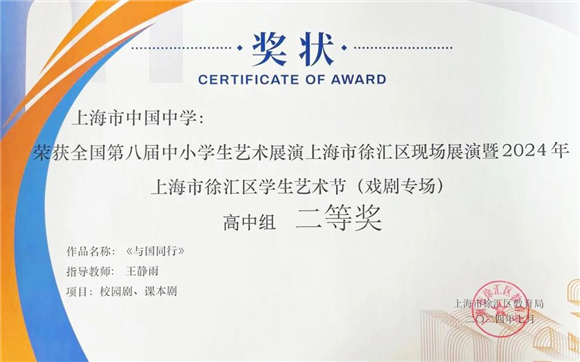 艺海扬帆,佳绩频传!近期,上海市中国中学学子在2024年上海市徐汇区学生艺术节中以卓越表现赢得多项荣誉,让校园文化之花在艺术的舞台上绚烂绽放。在此,向所有获奖的同学表示热烈的祝贺!