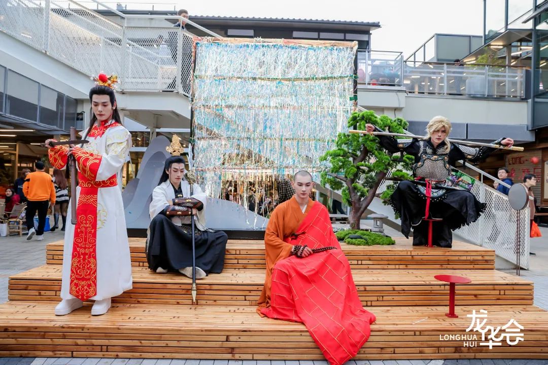 踏入龙华会,就仿佛瞬间穿越到神话世界,火焰山的炽热、金箍棒的威严、水帘洞的清凉、盘丝洞的神秘,仿佛每个场景都带领人们穿越神话。在这里,市民可以自由穿梭于这些充满童年回忆的布景中,开启一段别开生面的沉浸式旅程。不仅日光草坪、妙街等地的布置让人倍感惊喜,活动首日,孙悟空、唐僧、杨戬和小白龙等角色coser还进行不定时的巡游,为市民带来意想不到的奇趣互动。