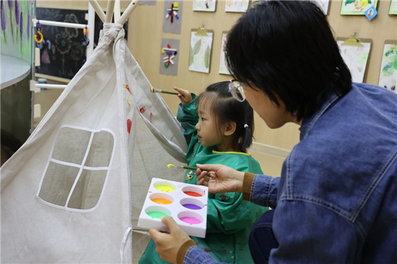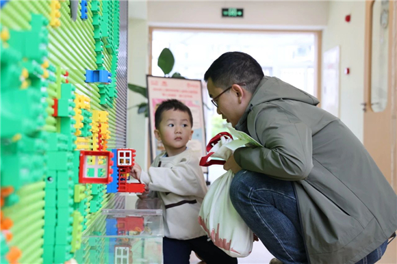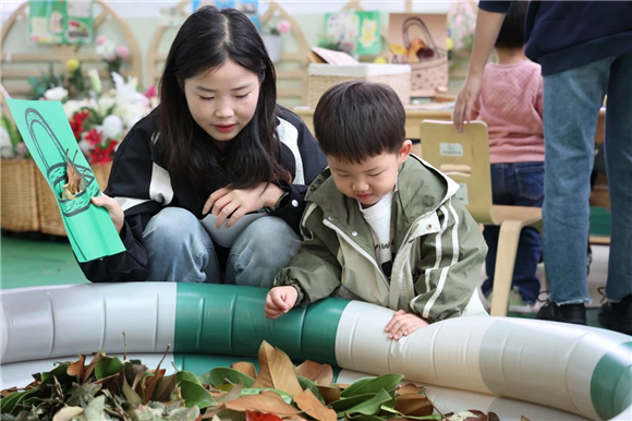 在分会场——徐汇区机关建国幼儿园滨江园中,聚焦“智‘汇’育儿友好‘童’行”主题,为2-4岁幼儿创设的室内外游戏受到了亲子家庭的欢迎,友爱小宝贝、快乐小农夫、宝贝爱探索......在温情友好的氛围之中,孩子们的运动、探索、语言等能力都得到了发展,家长们也仿佛回到了“一米高度看世界”的童年时光,与孩子们共享了亲子游戏的乐趣。