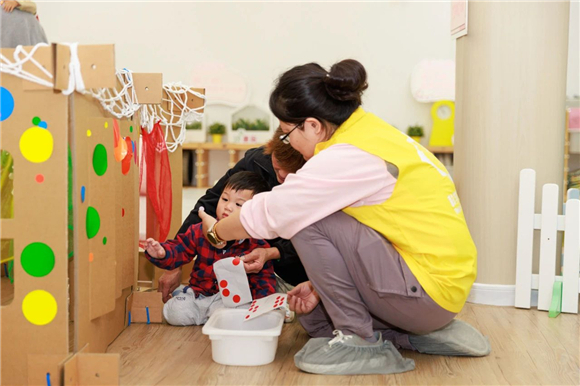 在另一处分会场——徐汇区斜土社区育儿指导站里,老师们精心设计的游戏活动吸引了60组家庭的积极参与,十余种充满想象力和情境性的游戏,使0-2岁小宝宝们畅快乐玩、流连忘返。