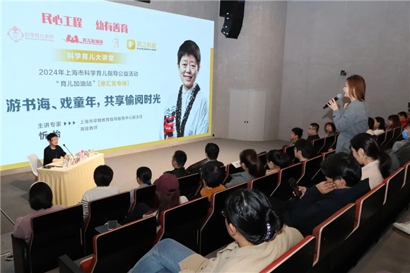 活动邀请了上海市早期教育指导服务中心副主任、高级教师忻怡老师,以“游书海、戏童年,共享愉阅时光”为主题,向家长展示了如何从多种多样的绘本中挑选适合自己孩子的内容,并与家长共同探讨如何开展一段愉悦的亲子共读时光。通过讲座,忻老师也一一解答了宝爸宝妈在亲子阅读中经常遇到的问题,让家长们收获颇丰。