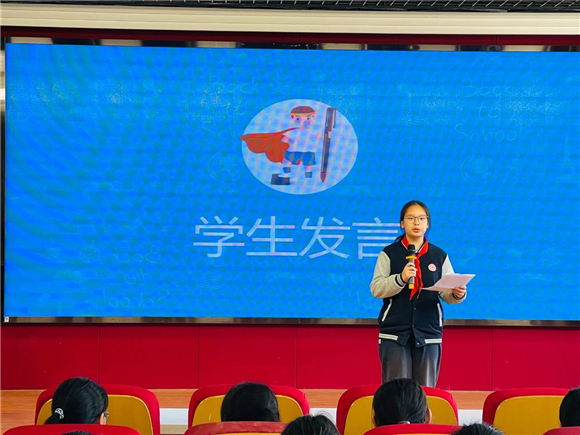 初三(2)班的任姿晔同学则饱含情感地号召同学们勇攀高峰,铸就辉煌;告诉同学们中考的备战,不仅需要勤奋,更需要规划合理的学习计划;同时充足的休息时间、适量的锻炼,都是保持良好状态的关键;她呼吁同学们保持坚定的信念和不懈的努力,去走出属于自己的精彩人生!