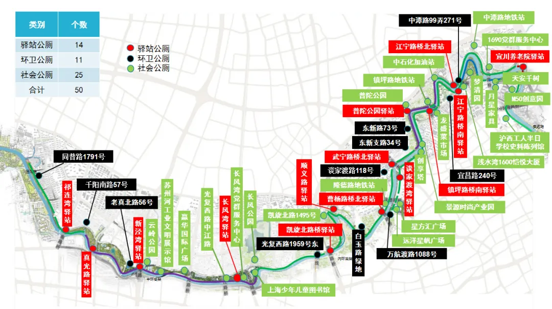 此外,普陀区积极探索推进除环卫公厕外的其他三类公厕对外开放和规范管理。目前,普陀区辖区内21公里长的苏州河沿线各类公厕数量达50座,平均约420米即有一座,极大地提升了市民如厕便利性。