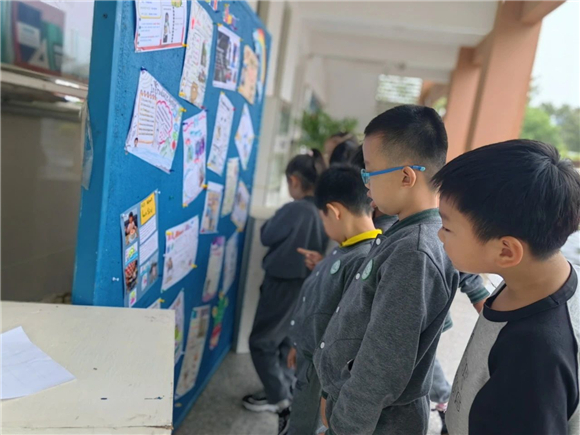 每一张海报都彰显着孩子们的创造力、表现欲和对学习的热情。有的同学将自己擅长的舞蹈以色彩斑斓的画面呈现,画中的小人儿仿佛在海报上翩翩起舞,旁边用英语单词似乎都在跟随着她的舞姿跳跃。