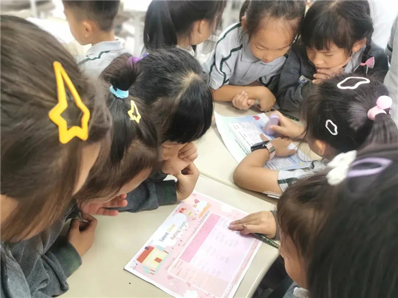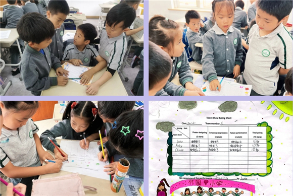 才艺展示的评选要从哪些方面进行呢?小笋芽们通过分组合作来制作评分表的过程是一次深度的思维碰撞和团队协作体验。孩子们分成小组,有的提出评价维度,有的用英语将这些维度清晰地写在评分表上,还有的同学设计评分的分值和等级……最终,笋芽们讨论的评价标准经过老师的指导完善,投入使用。