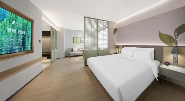 踏入酒店的那一刻内心不自觉的平静和放松得益于"松弛感";在酒店餐厅抬头望向客房阳台时脑海中的诗意联想取决于"氛围感";绿色原木环保风给予的清晰品牌记忆点归功于"存在感";会议室、健身房、茶歇区、餐厅等场所的开放设置则是"社交感"的淋漓诠释。