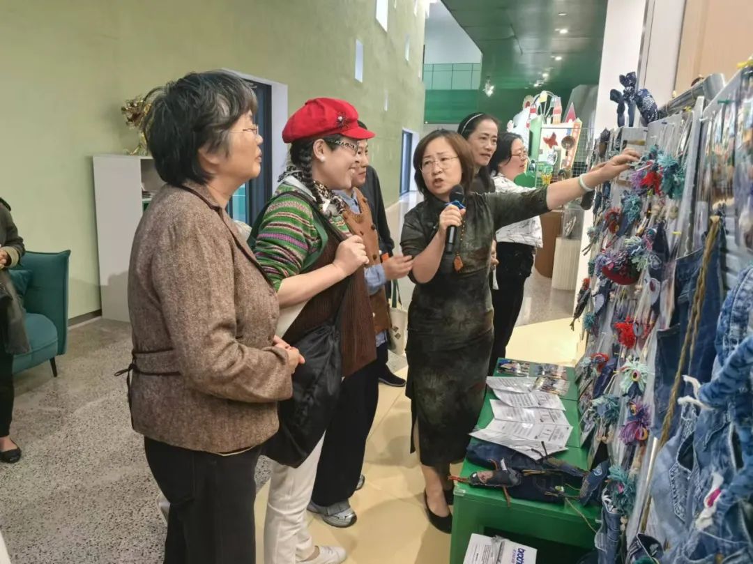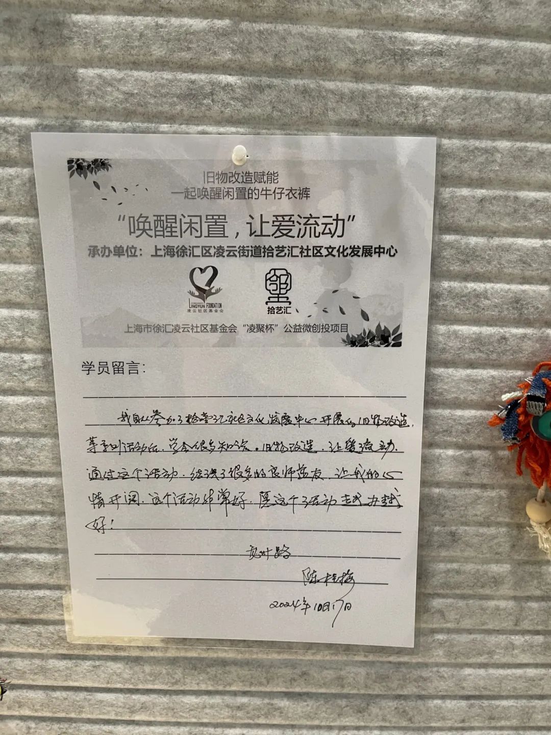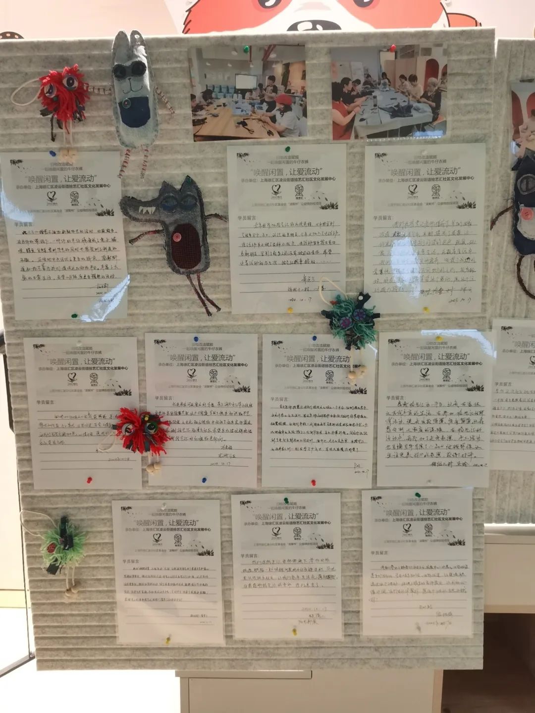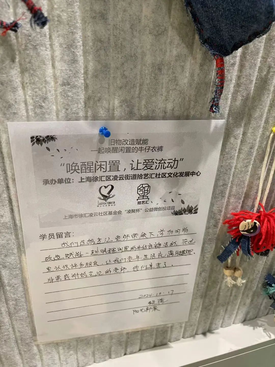 在发布会现场的展览区,专门展出了学员们的作品:旧牛仔裤改造的斜挎包、手拎包,旧衣服、旧毛线制作的“小怪物”、小毛球包包挂件,旧牛仔布和蜡染布做的发夹,呆萌可爱又有趣。一幅幅照片则再现了活动开展时的场景。参与活动的人员,几乎涵盖了老中青少幼各个年龄层。学员们还亲笔写下了自己的学习感悟。