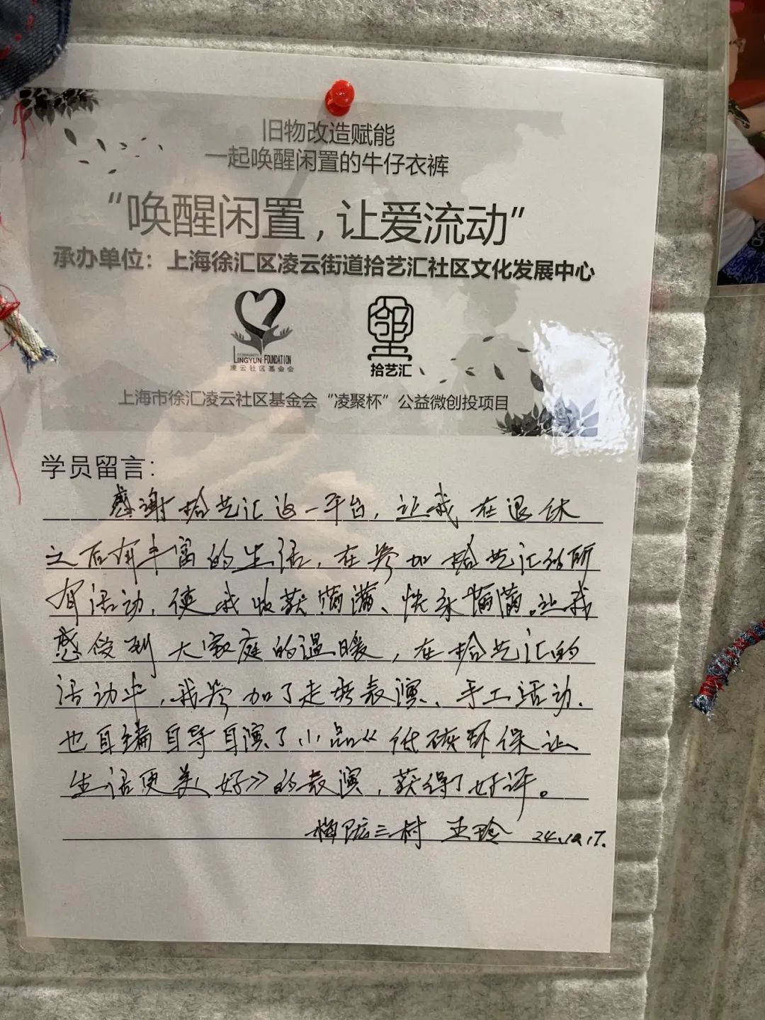 居民马阿姨特别有感触。她退休以后,从外省市来到上海,帮忙子女带孩子,离开了熟悉的老环境和老朋友,每天买菜做饭带孩子,生活内容单一。后来她在邻居宋云的带动下加入了拾艺汇,参与编织和旧物改造,学习绘画书法,练习八段锦……精神面貌焕然一新。