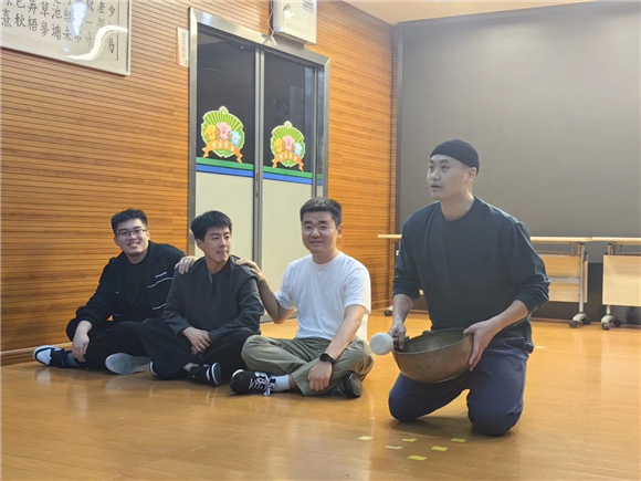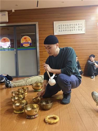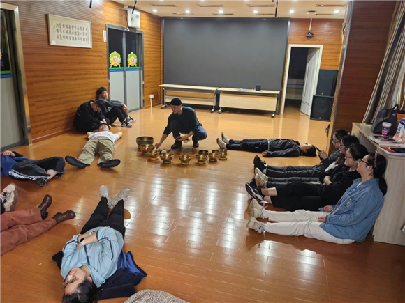 最后,圆明老师详细地介绍了颂钵,颂钵那空灵的声音仿佛已经在教室中回响。这场青年教师颂钵团体辅导,宛如一场及时雨,滋润着青年教师们略显疲惫的心灵,让他们在繁忙的工作之余,能够找到一片宁静的心灵栖息地,也能够在此之后更好地投入到教育教学工作当中,创造新阶段的成就和辉煌。