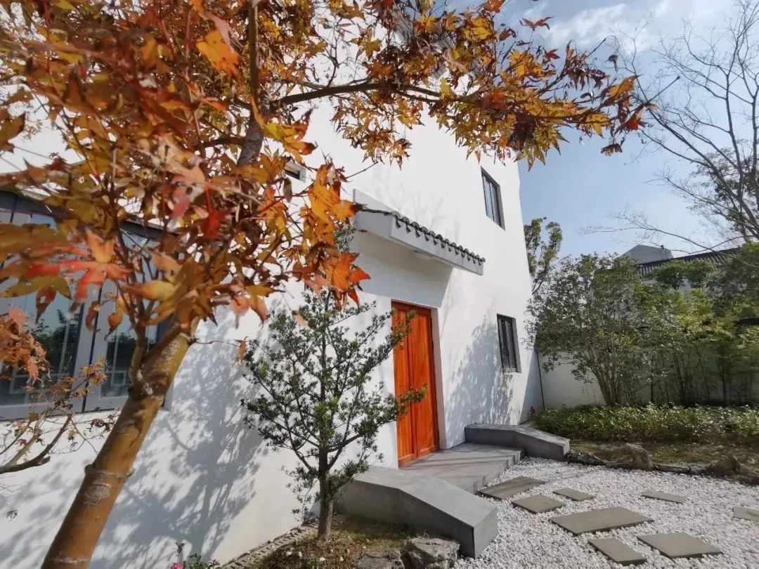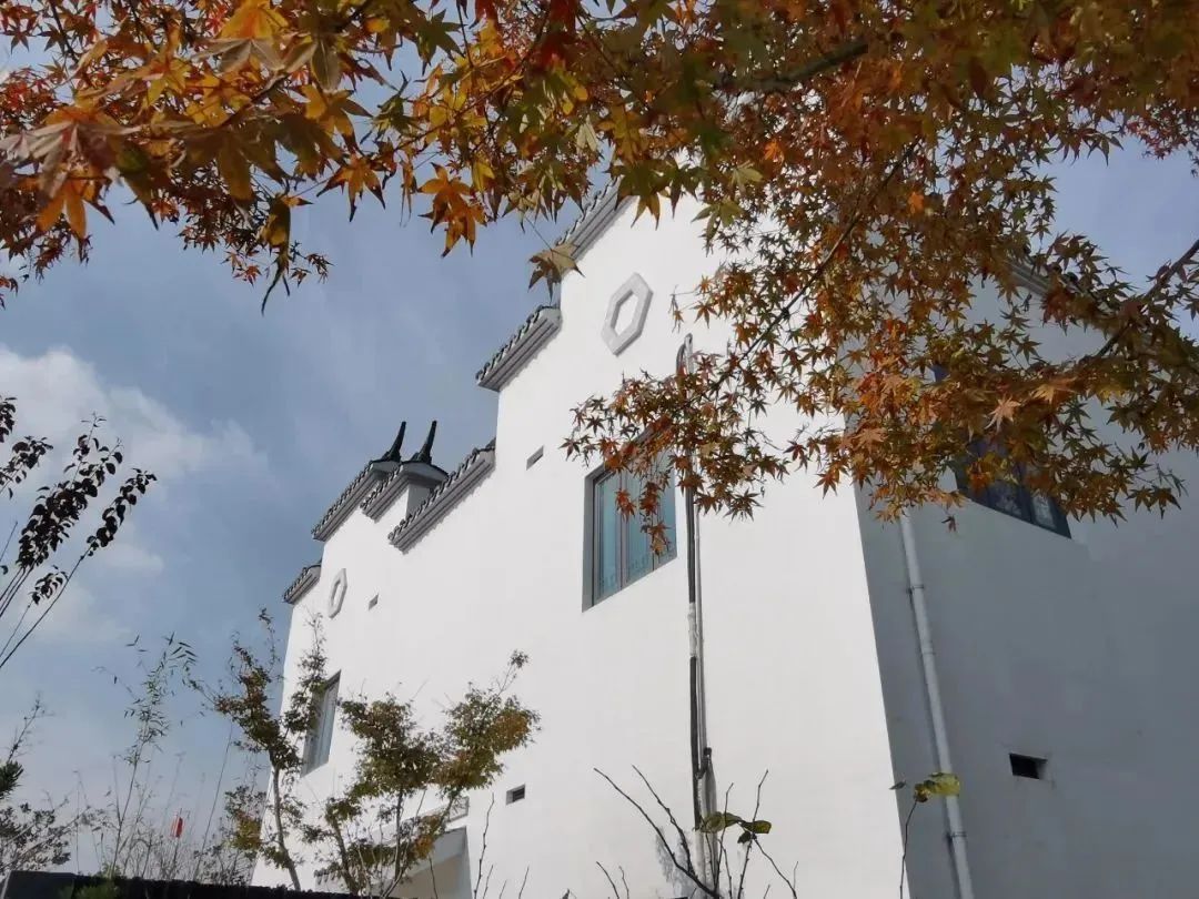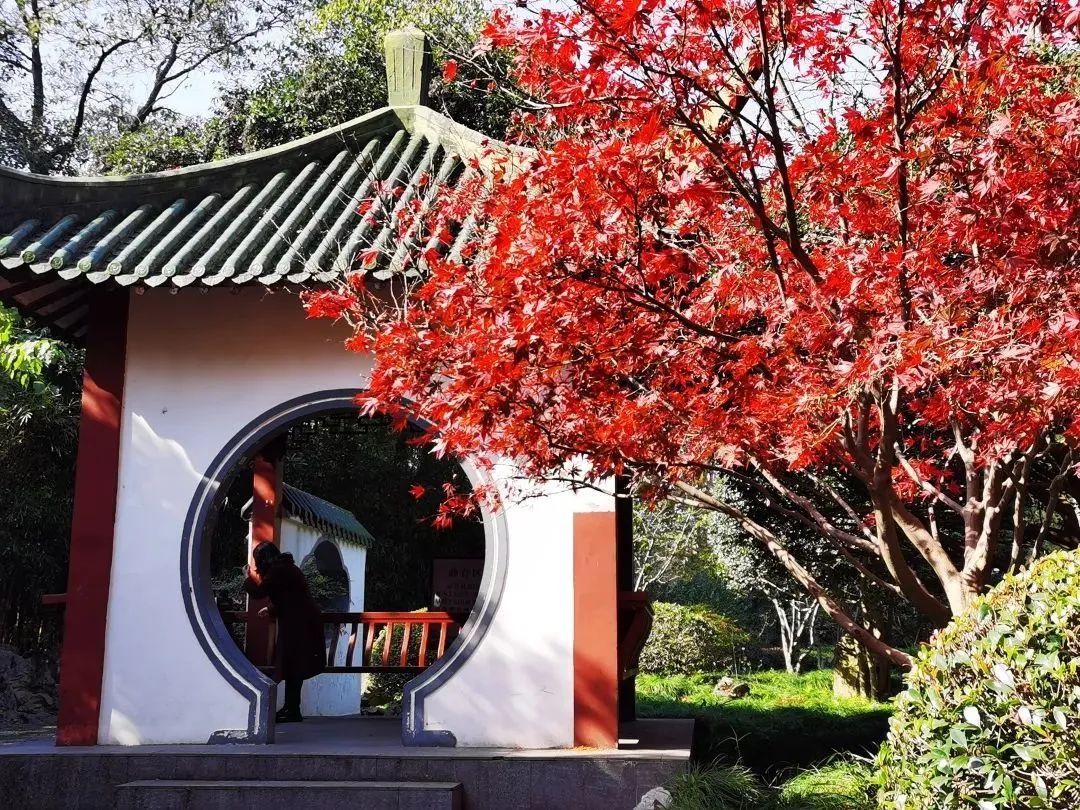 除了中山公园,在长宁,拍红枫出片的还有中新泾公园。徽派建筑的白墙边,正红的枫叶,在阳光的映衬下,闪耀着惹眼的喜色。白墙、红叶还有徽派建筑红色的木门,组成了公园特别的景致。