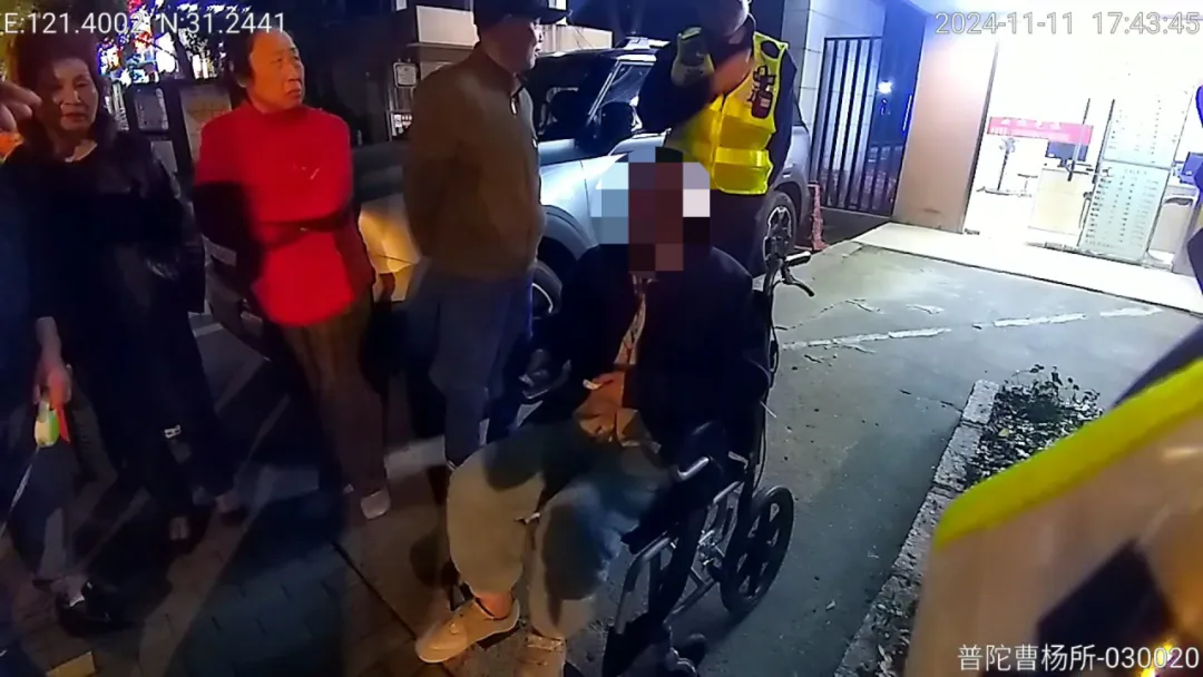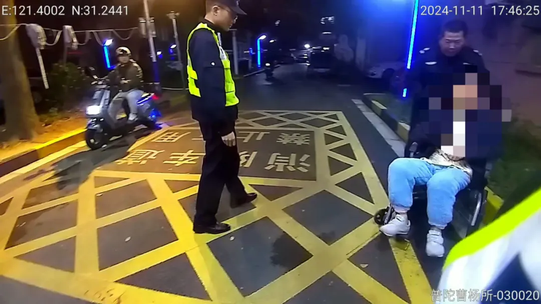 11月11日17时30分许,普陀公安分局曹杨新村派出所接群众报警称,其路过某医院门口时,看到一位老人坐在轮椅车上,东张西望,似乎在寻找什么,疑似迷路。民警立即赶赴现场,找到了报警人所述的迷途老人。