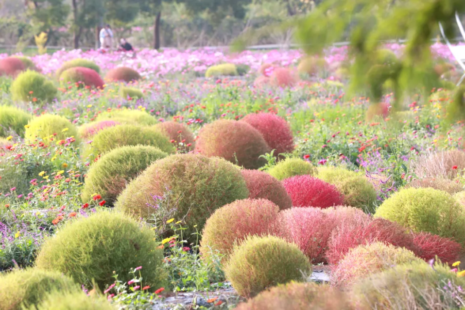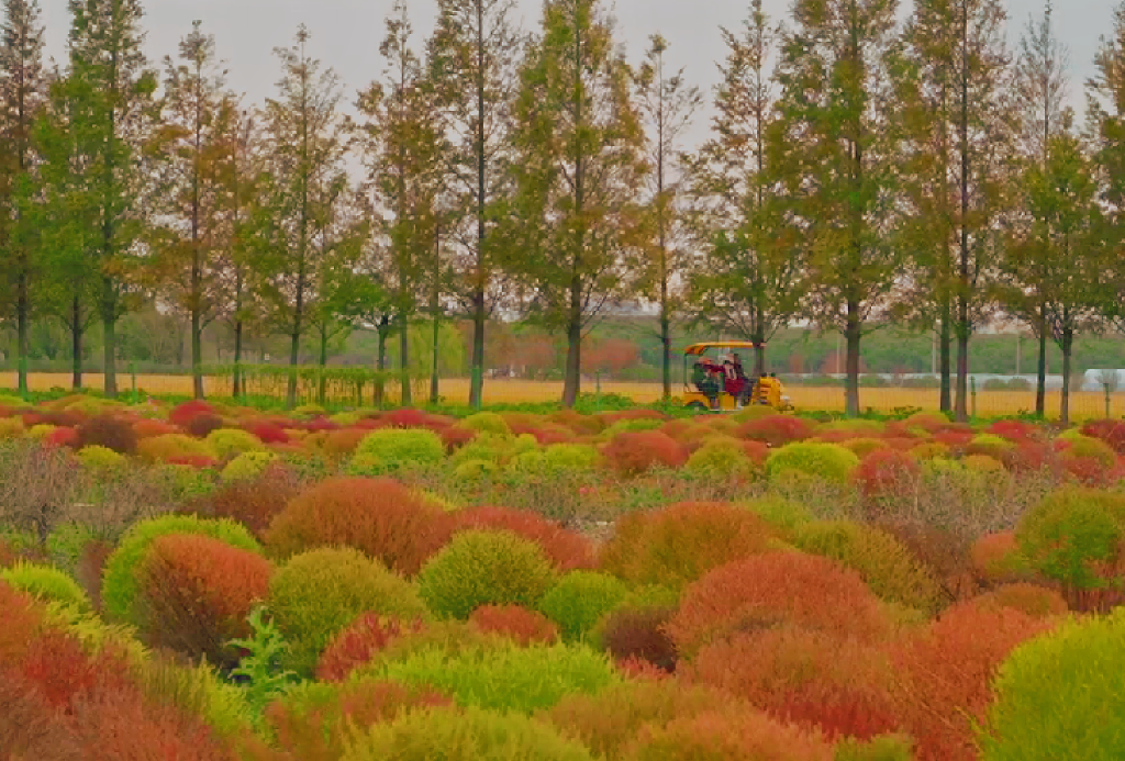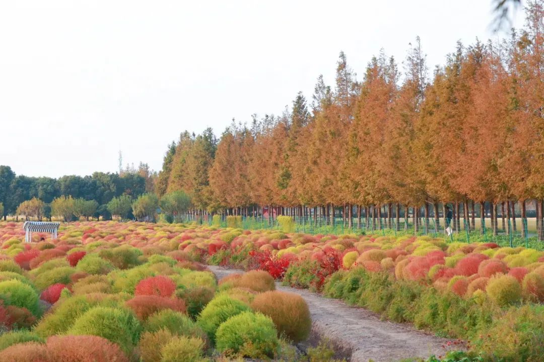 近看,一株株地肤圆润饱满,整齐地分布在田间,宛如一簇簇柔软的绒球,与远处摇曳的水杉与穿梭其间的黄色游览车相映成趣,共同构成了一幅生动的秋日田园画卷。