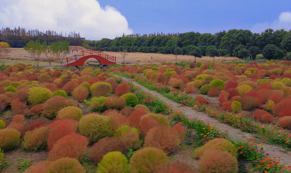 走进嘉北郊野公园,一片片色彩斑斓的地肤映入眼帘,从翠绿渐变至金黄,再点缀以火红的热烈,最终汇聚成一片金黄色的海洋。
