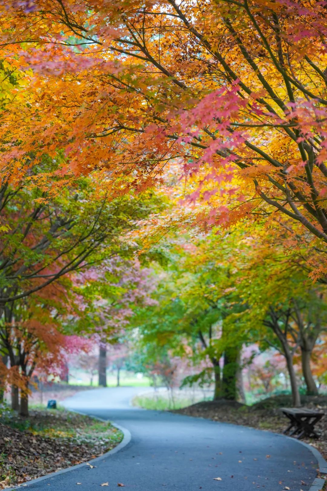 荻花路、五彩小径、星空草坪、枫林小径、枫叶岛等地方,到12月下旬都能观赏到绝美的枫叶景观。脚下是落叶铺成的金黄色地毯,耳边是秋风拂过树叶的沙沙声,每一步都踏着浪漫,每一刻都充满诗意。