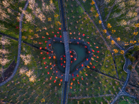 鸡爪槭、美国红枫、无患子、密枝卫矛等树种,或高或低,或疏或密,红的艳、橙的金、黄的亮、绿的透,在秋风的吹拂下,相互交织,彼此映衬。
