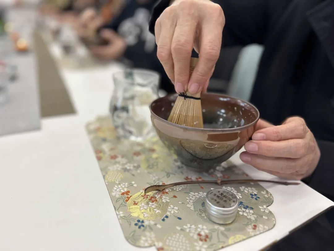 只见她将茶叶末放在茶碗里,注入少量沸水调成糊状,慢慢加入更多热水,用茶筅不断击打。渐渐地,茶汤表面泛起了厚厚的泡沫,如同一层细腻的积雪。“这种加入热水的动作被称为‘点’,‘点茶’因此得名。”科普老师介绍道。