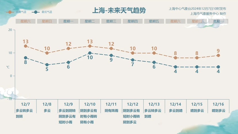 明天周日,上海天气以多云为主,阳光闪现,但冷空气影响下,气温将跌至近期低点,全天只有5~10℃,阵阵西北风带来冬日体感,出行记得多穿些。