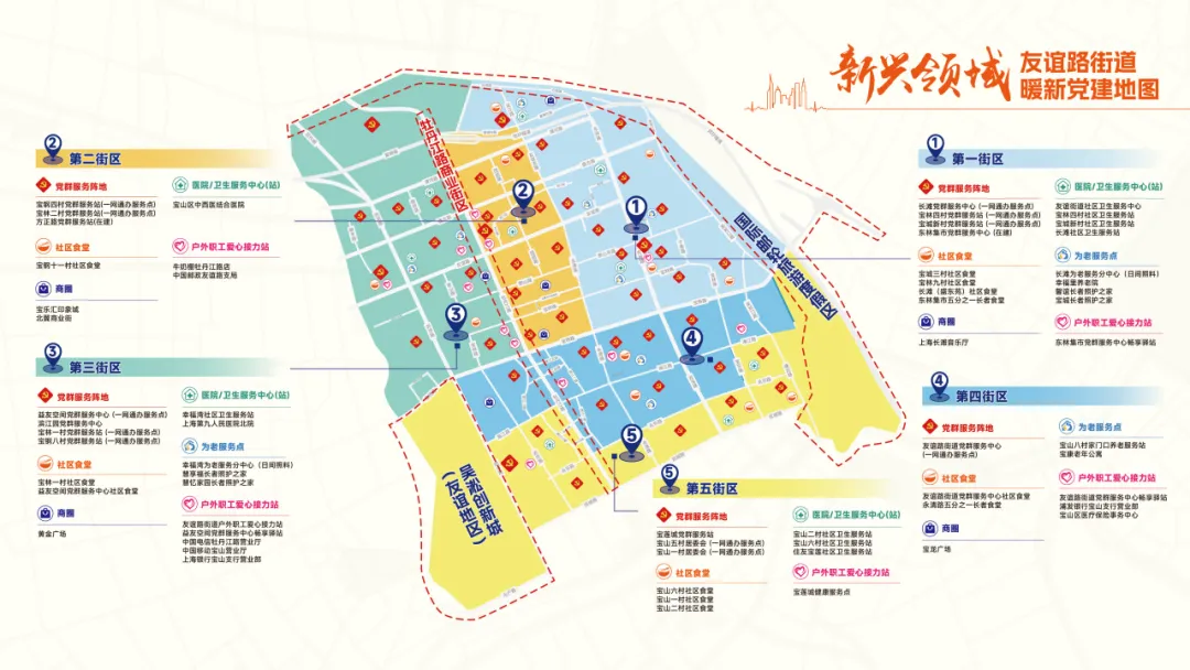 街区范围:东至长江,南至宝杨路,西至友谊支路,北至云海路。主要覆盖上海·海上世界、东林集市等商圈。街区面积2.27平方公里,覆盖人口约3.9万人。