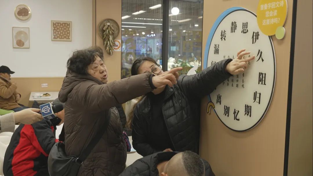 更有趣的是,食堂墙面设计了一款“认知预防干预游戏”。几个长者聚在一起轻声交流,手指在游戏上滑动操作,尝试完成小任务,互动设计给认知关爱增添了趣味性。