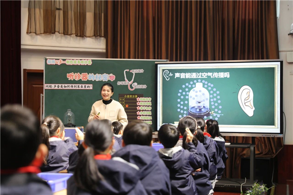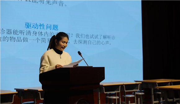 首先,学校自然学科的唐晔老师呈现了一堂项目化学习实践教学课《听诊器的秘密》。