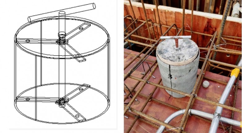 可周转的楼板洞口预留成套技术。基于可拆卸、可周转的思路,对规格集中、工作量大的水暖管道、桥架楼板孔洞预留模具进行了优化、创新,研发了可拆卸式预留洞套管、可拆卸铝模洞口预留装置、预埋式桥架连接构件装置等一整套可周转的楼板洞口预留装置,大幅提升了楼板洞口预留预埋效率及洞口成型质量,且装置可拆除周转使用,降本增效。