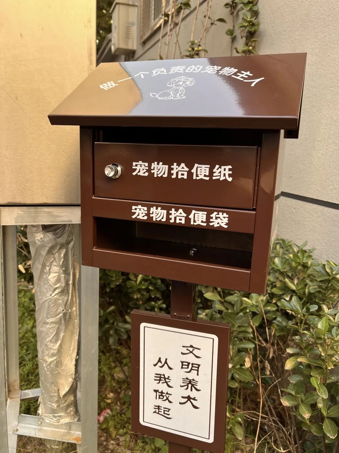 为了改善这一状况,近日,周家湾居委会积极响应居民诉求,为周家湾各小区配置了12个宠物拾便箱。这些拾便箱被放置在小区内居民遛狗较为集中的区域,方便居民在遛狗时随时取用宠物拾便纸,及时清理宠物粪便。这一举措得到广大居民的支持和点赞。