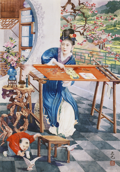 谢之光水粉作品《绣像图》《桃花玉兰香》